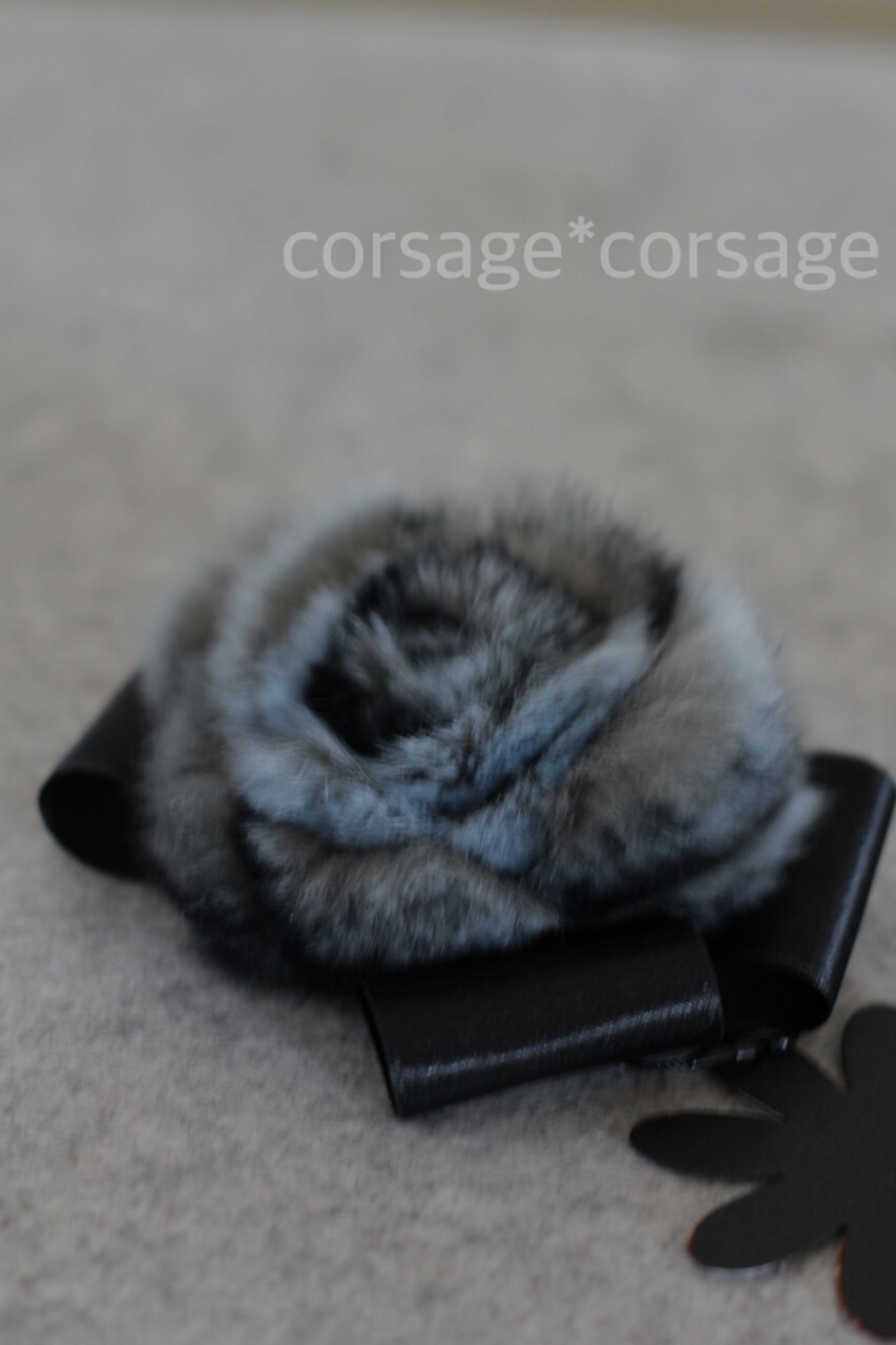 良質なラビットファーとサテンリボンを使用したシンプルなコサージュです。普段着からハレの席でもご利用いただけます。