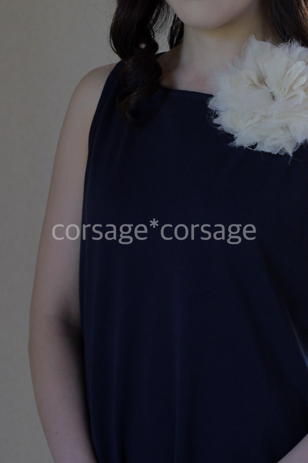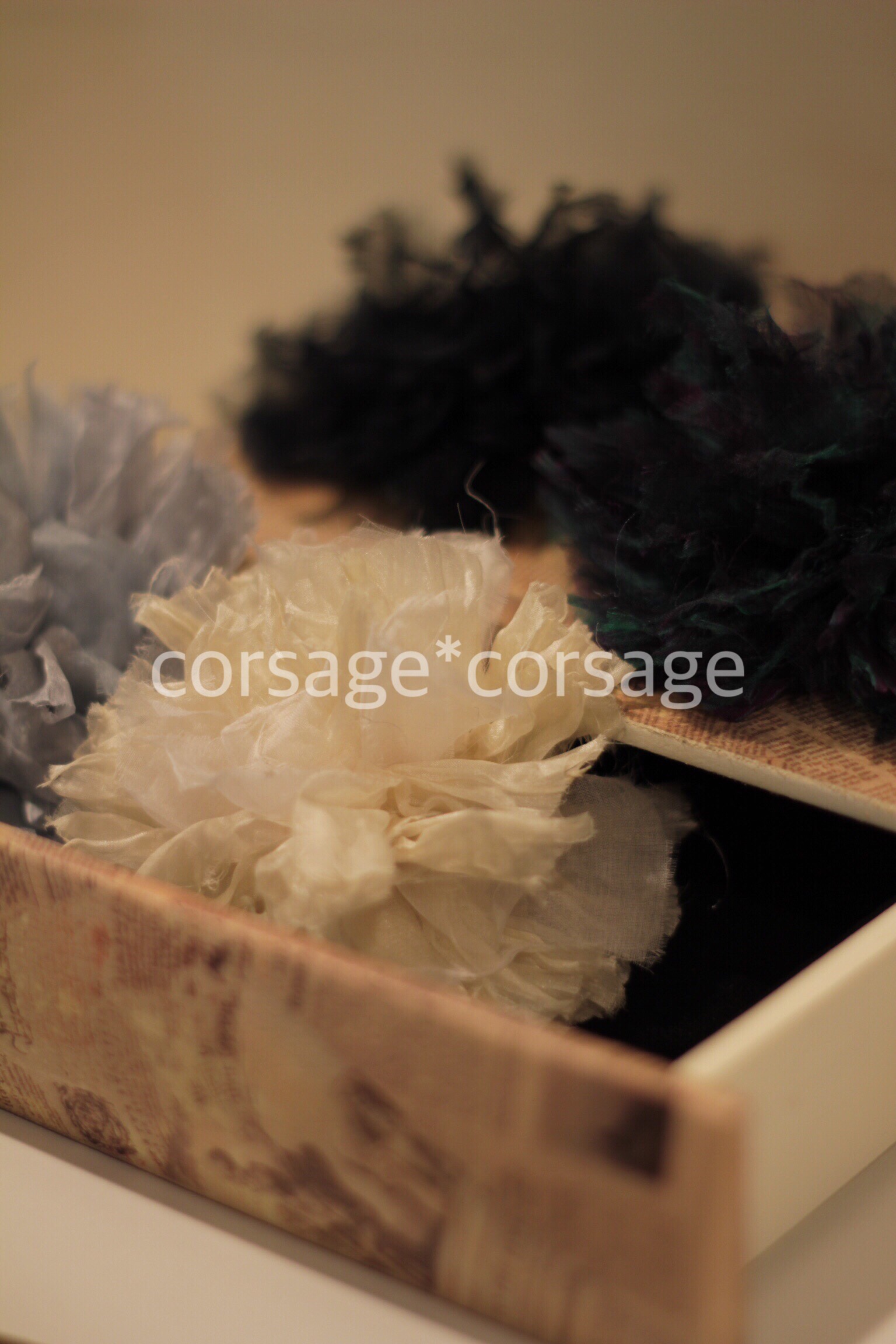 2種のシルクを使用しポンポン状に組んだコサージュです。